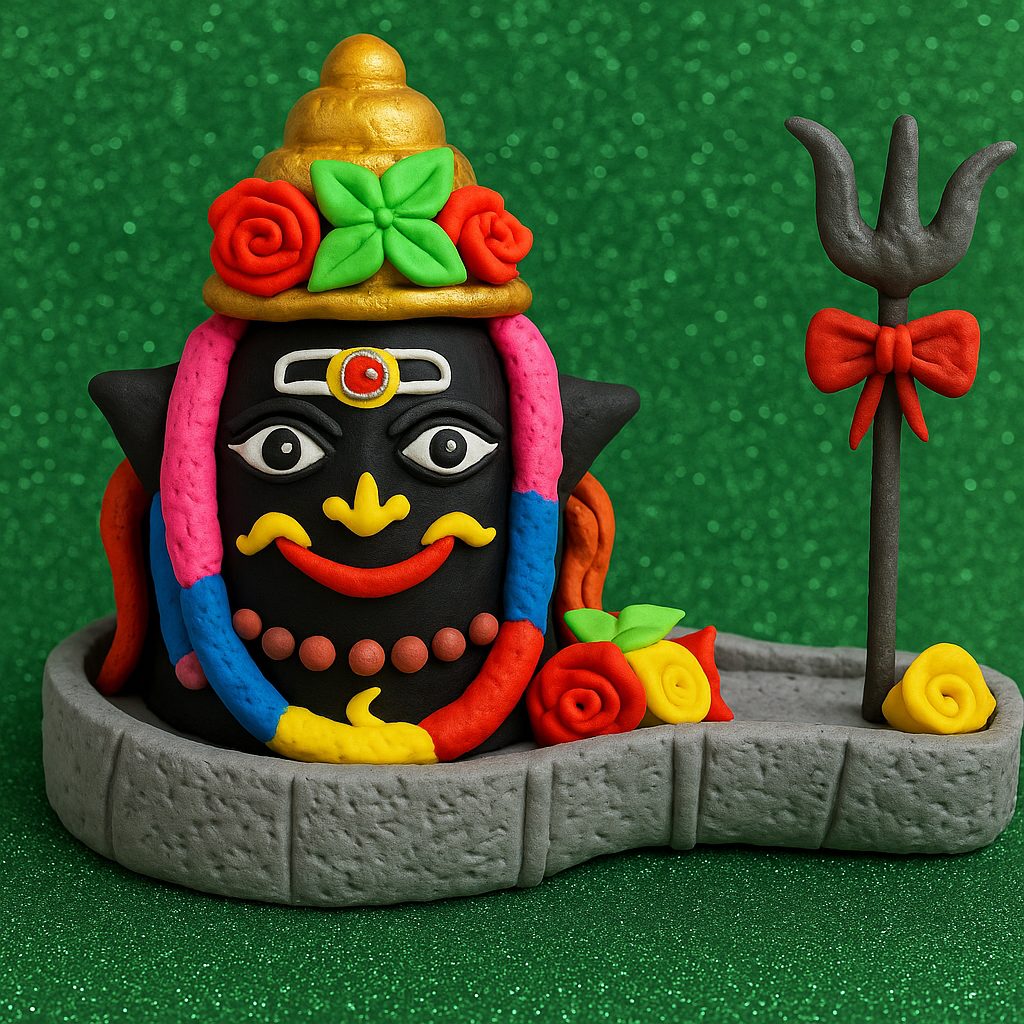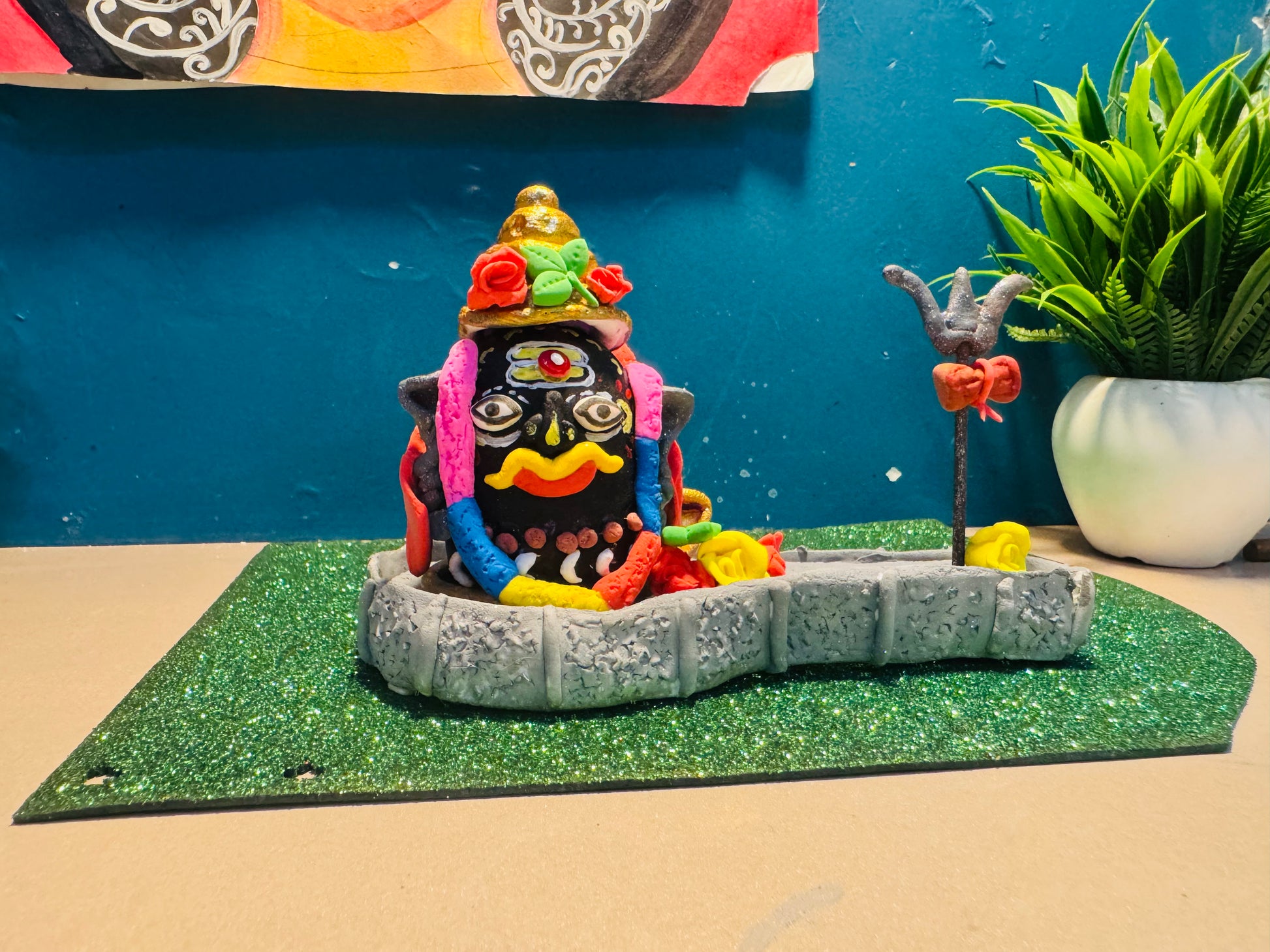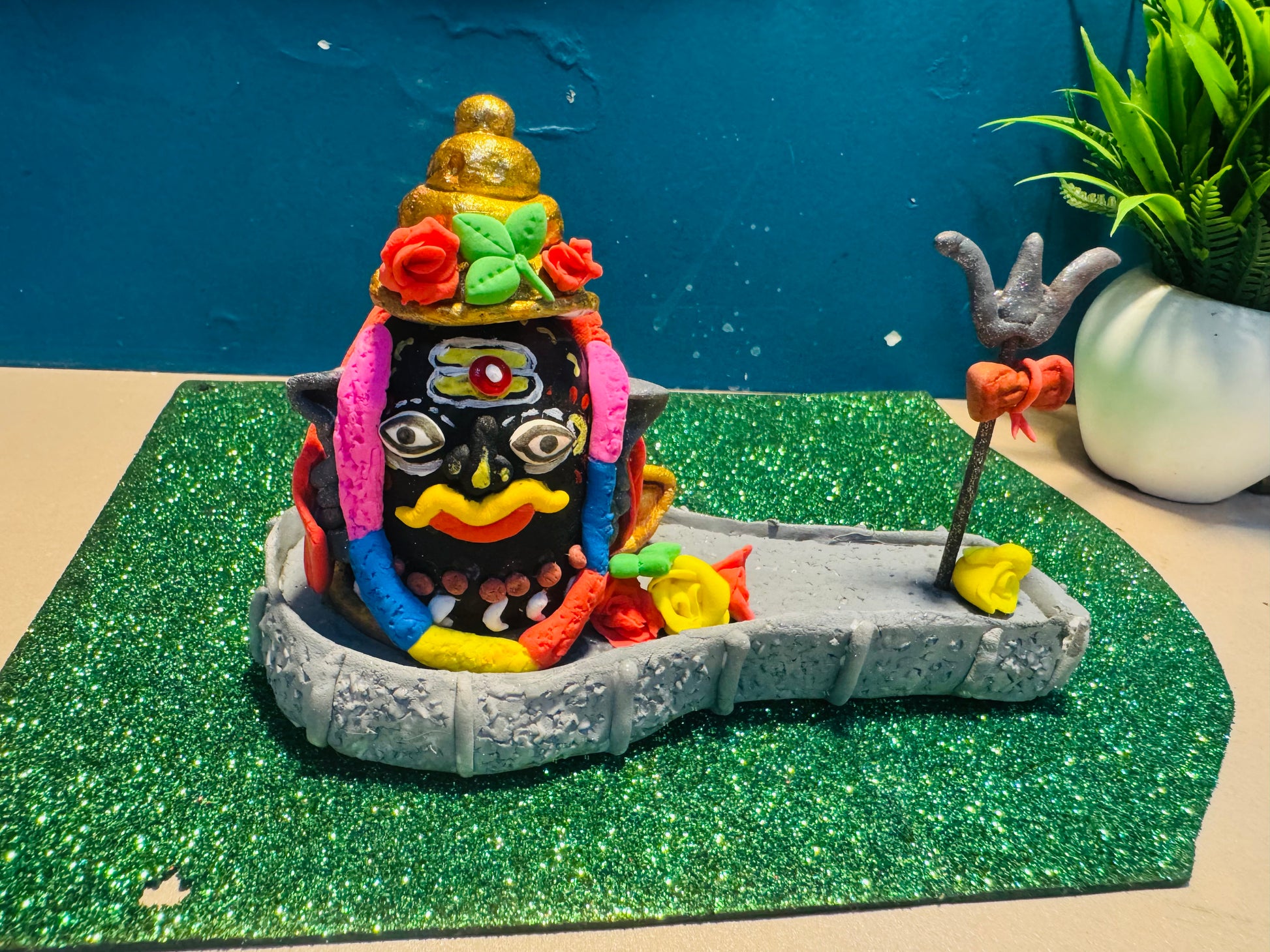 ring divine energy into your space with this vibrant handcrafted Mahakal Shivling Idol, made entirely from colorful clay. This unique creation showcases the fierce yet serene face of Lord Mahakal (Shiva) adorned with intricate detailing — including expressive eyes, vibrant garlands, a golden crown with flowers, and a symbolic Trishul. Perfect for home temples, gifting, or festive decor, this art piece sits beautifully on a glittering green base, symbolizing peace, power, and positivity.