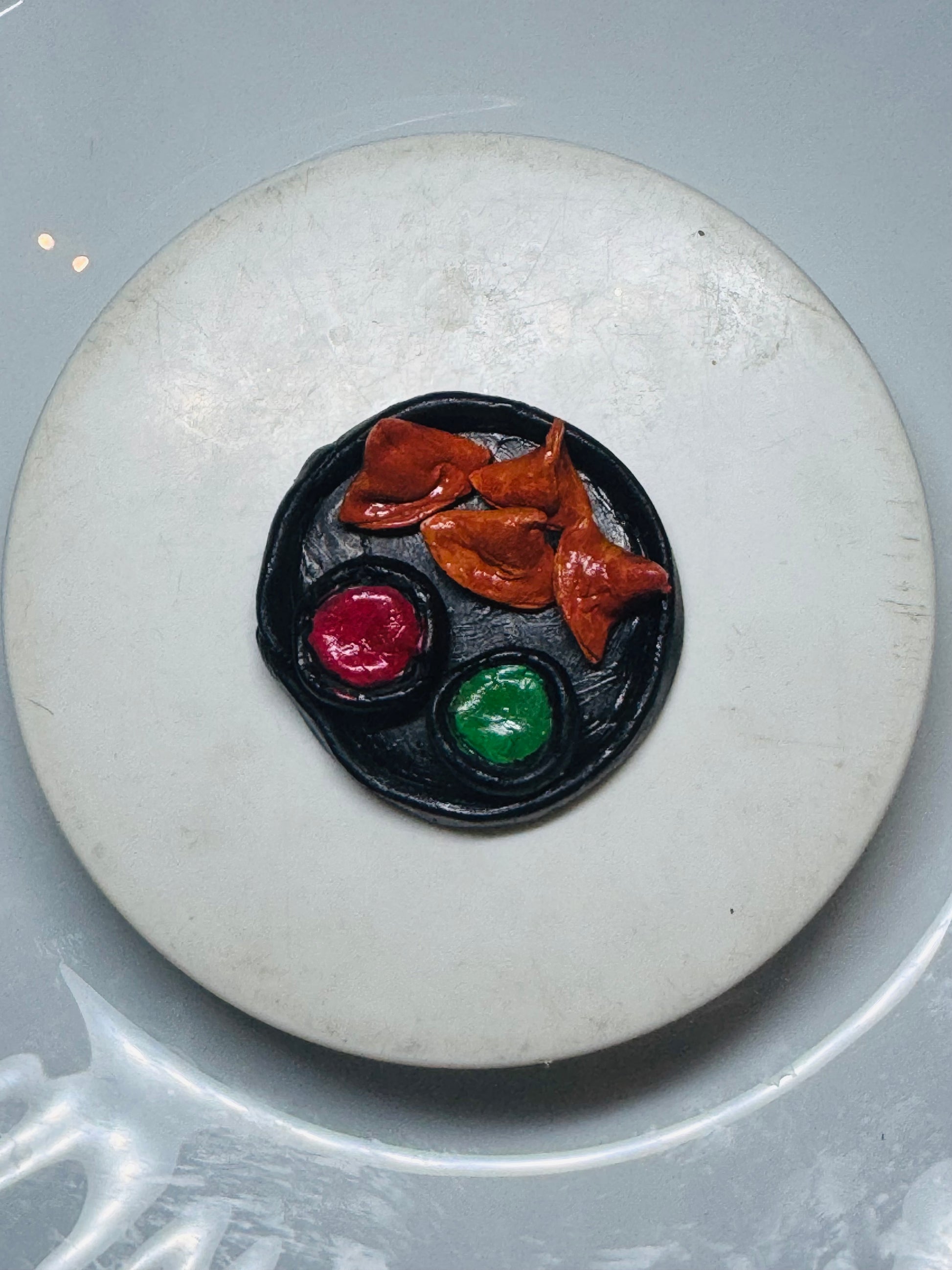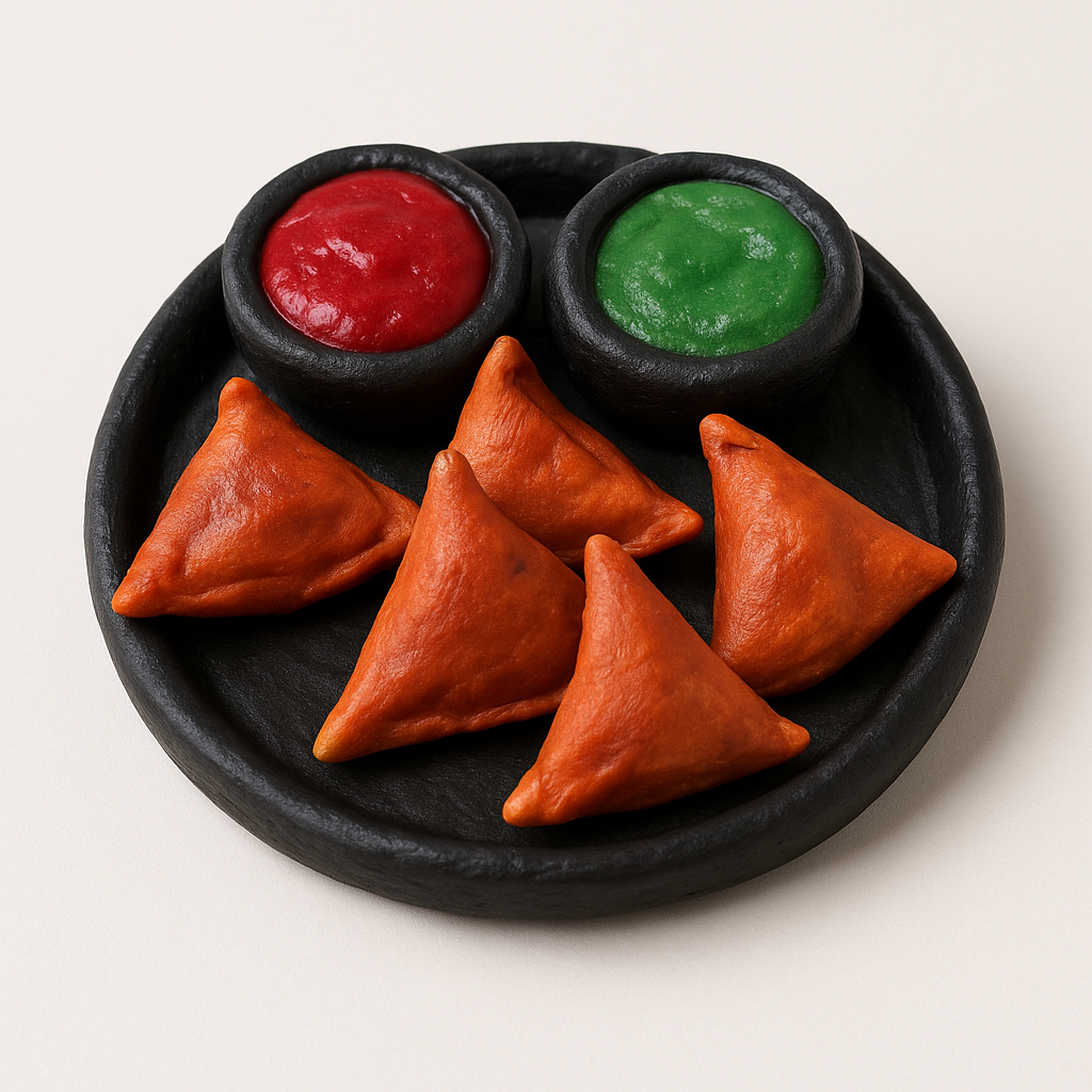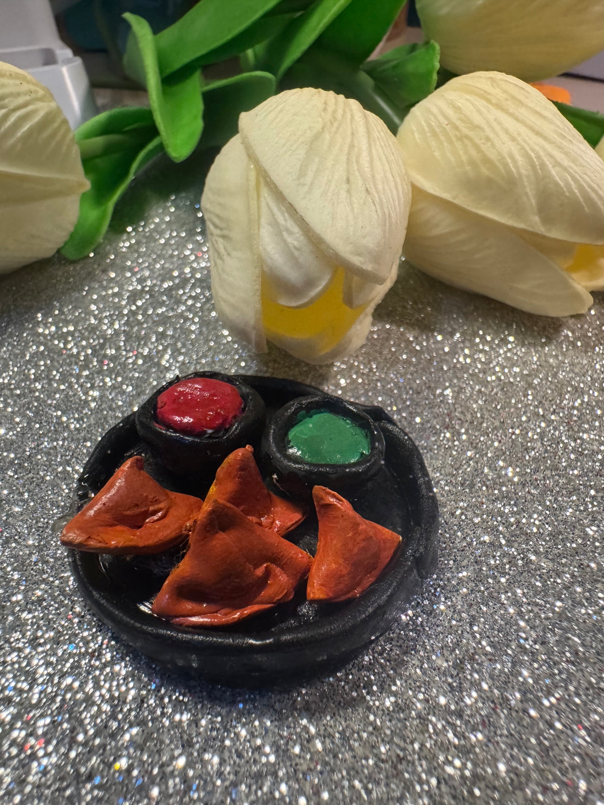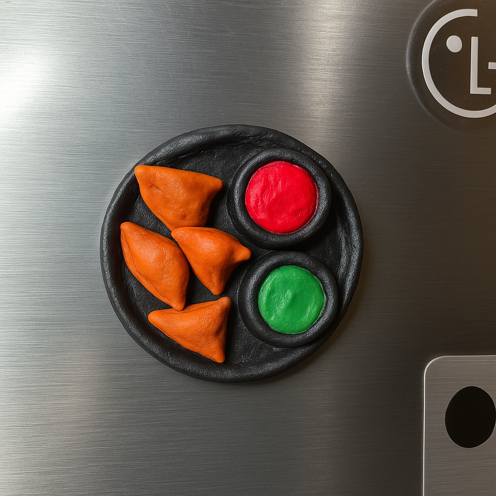 Add a quirky desi twist to your kitchen decor with this Mini Samosa Platter Fridge Magnet! Handcrafted to resemble a traditional Indian snack plate, it features four miniature samosas and two colorful chutneys — green mint and red tamarind — all placed on a round black tray. Made from durable clay/polymer, this magnet sticks firmly to any metallic surface, bringing a burst of cultural charm and fun to your fridge. Perfect for food lovers, collectors, or anyone who appreciates miniature art with a delicious touch.