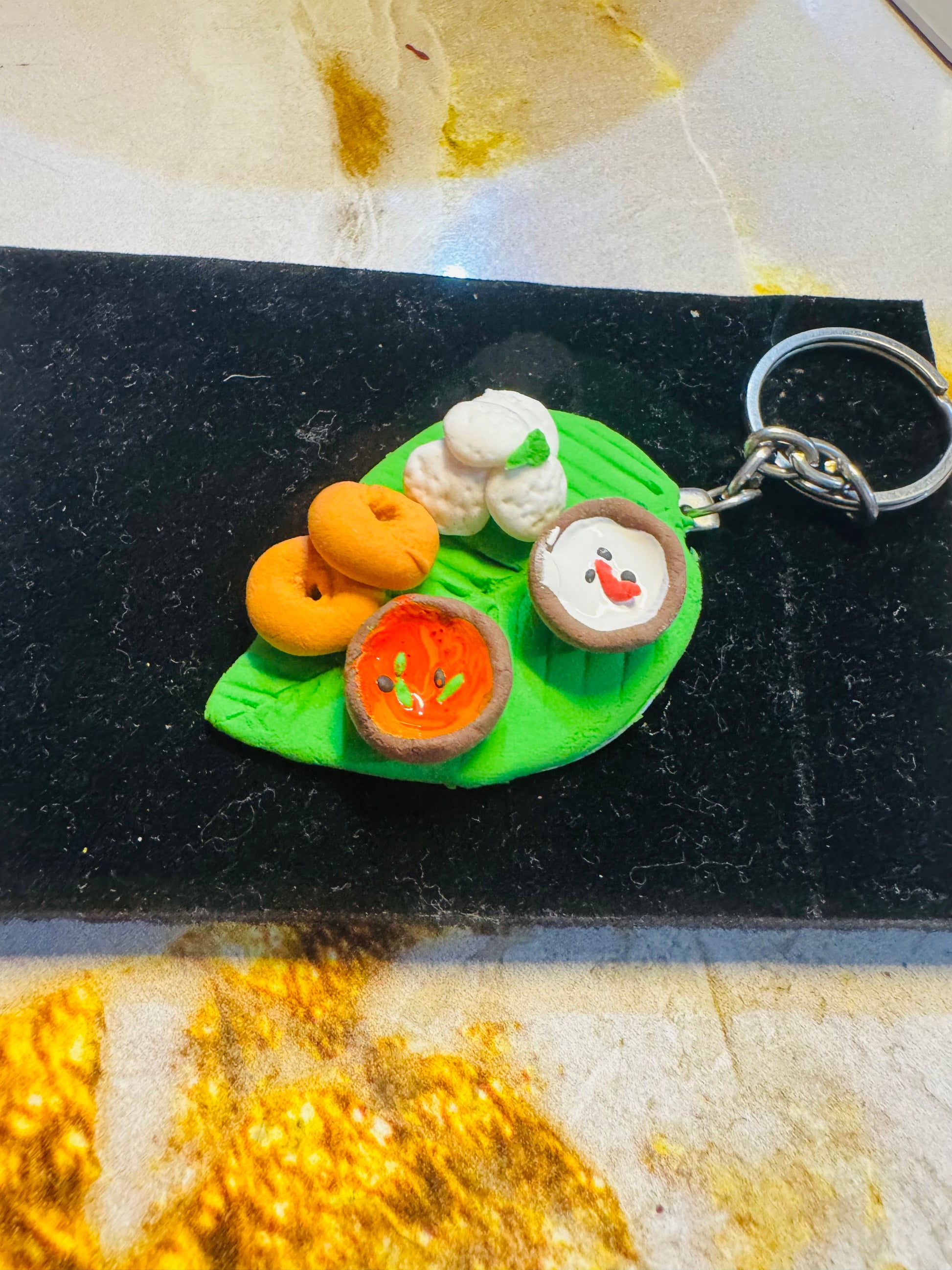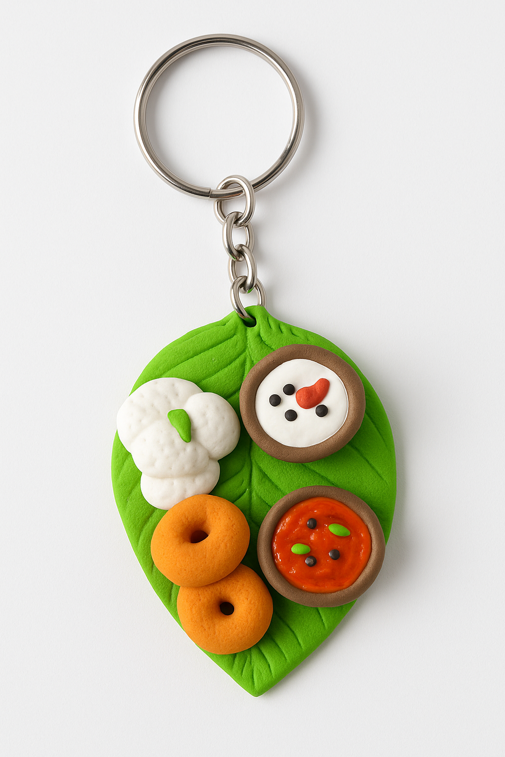Celebrate the charm of traditional South Indian breakfasts with this adorable handcrafted keychain! Made from high-quality polymer clay, this keychain features miniatures of soft idlis, crispy vadas, spicy sambar, and coconut chutney—all beautifully served on a vibrant green banana leaf. It’s perfect for foodies, culture lovers, or anyone who enjoys quirky, handmade accessories.