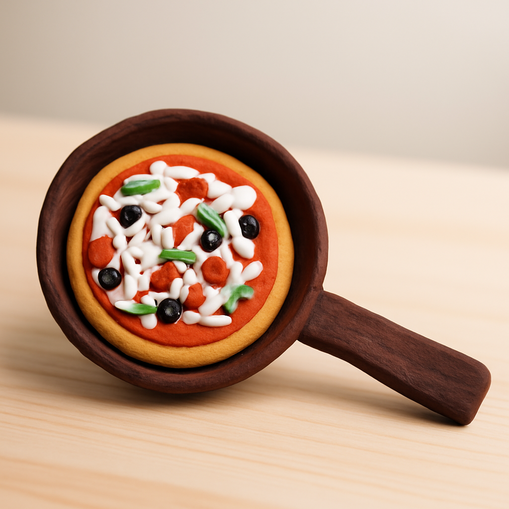 Lovingly handmade with polymer clay, this detailed miniature pizza in a skillet is a quirky, aesthetic piece of art perfect for home decor, dollhouses, gifting, or collectors.