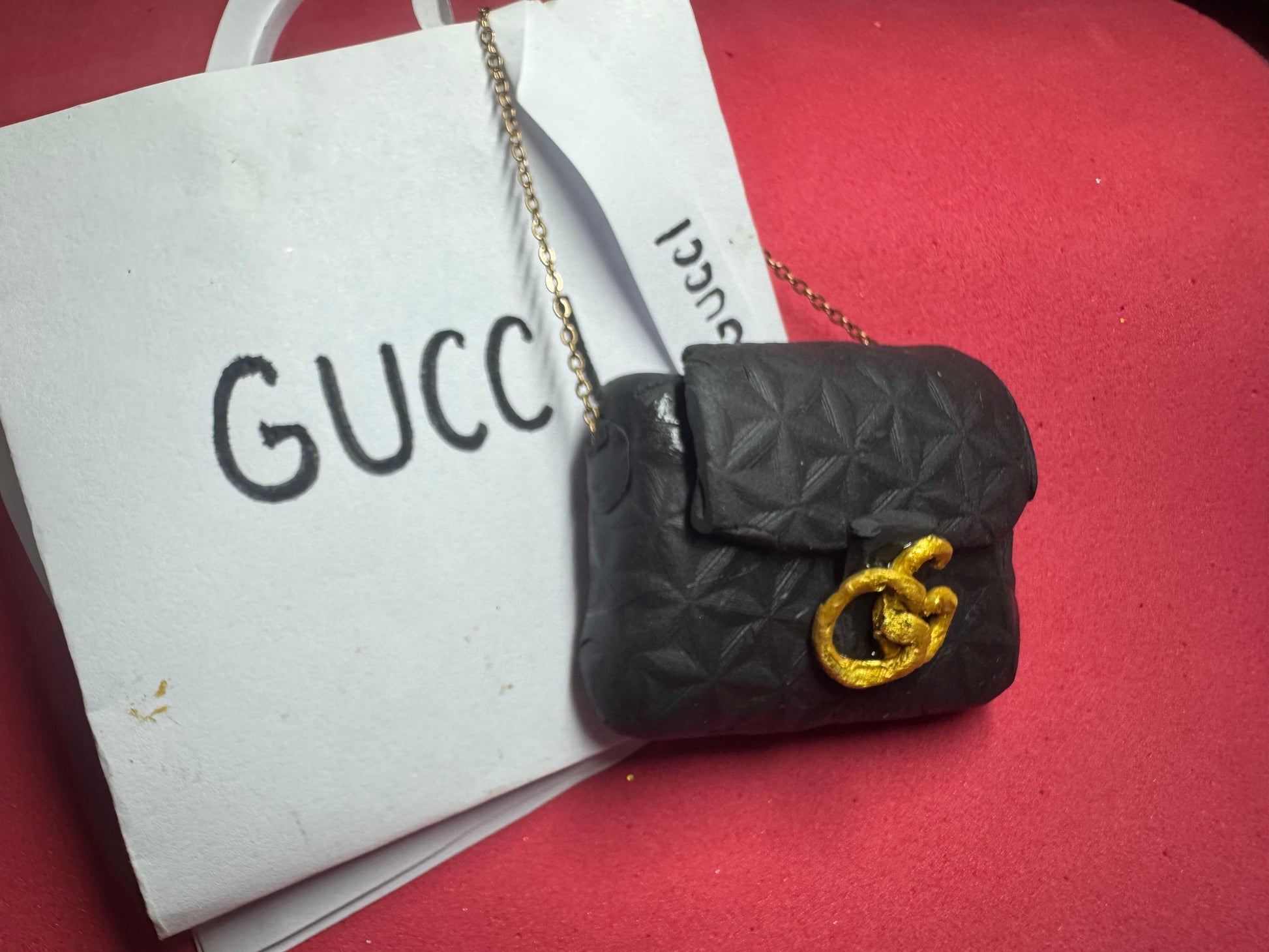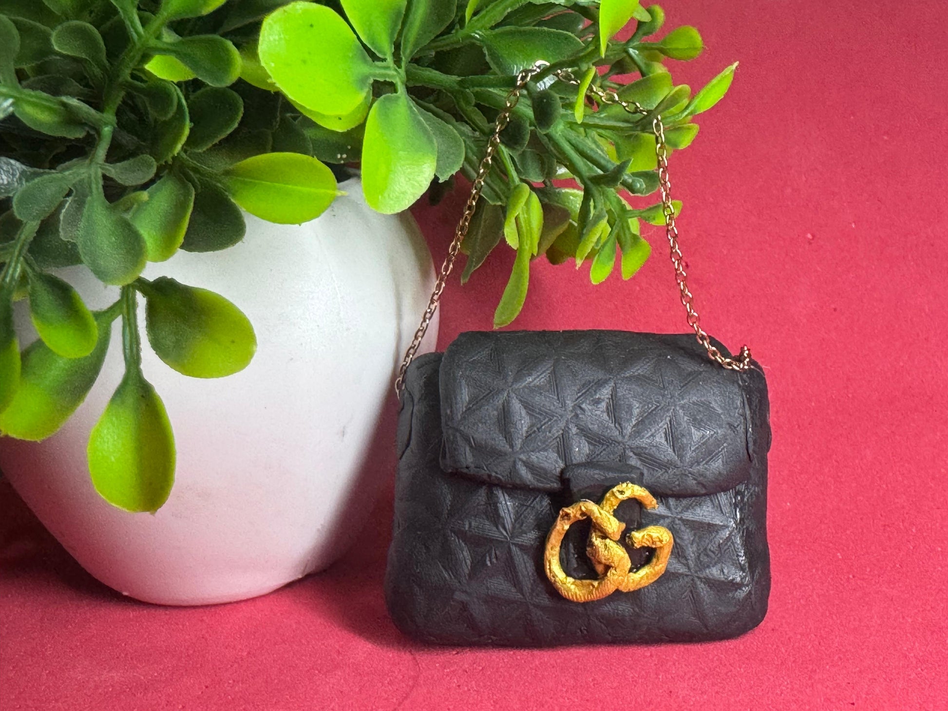 Elevate your miniature fashion collection with this handcrafted Gucci-inspired mini handbag. Made from high-quality clay and painted with precision, it features a quilted black leather-like texture, gold-toned double-G emblem, and a delicate golden chain. Comes with a handmade Gucci-style paper shopping bag for that luxe finishing touch.