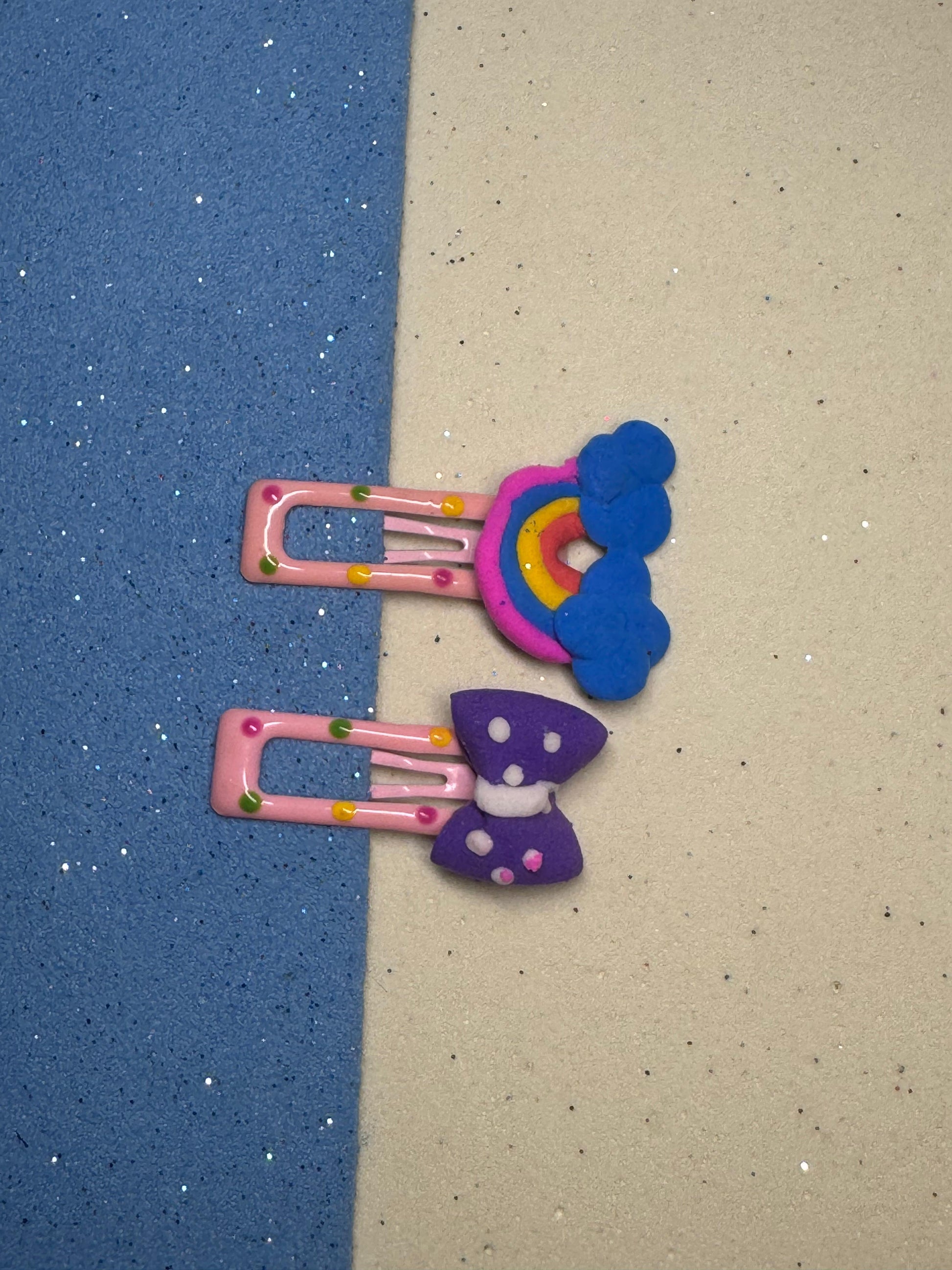 Add a pop of color and charm to your hairstyle with this handcrafted Rainbow & Bow Clay Hair Clip Set! Featuring two playful designs – a cheerful rainbow with clouds and a cute polka-dotted purple bow – these clips are made with premium lightweight polymer clay, secured on sturdy pastel pink metal clips with colorful dot accents.