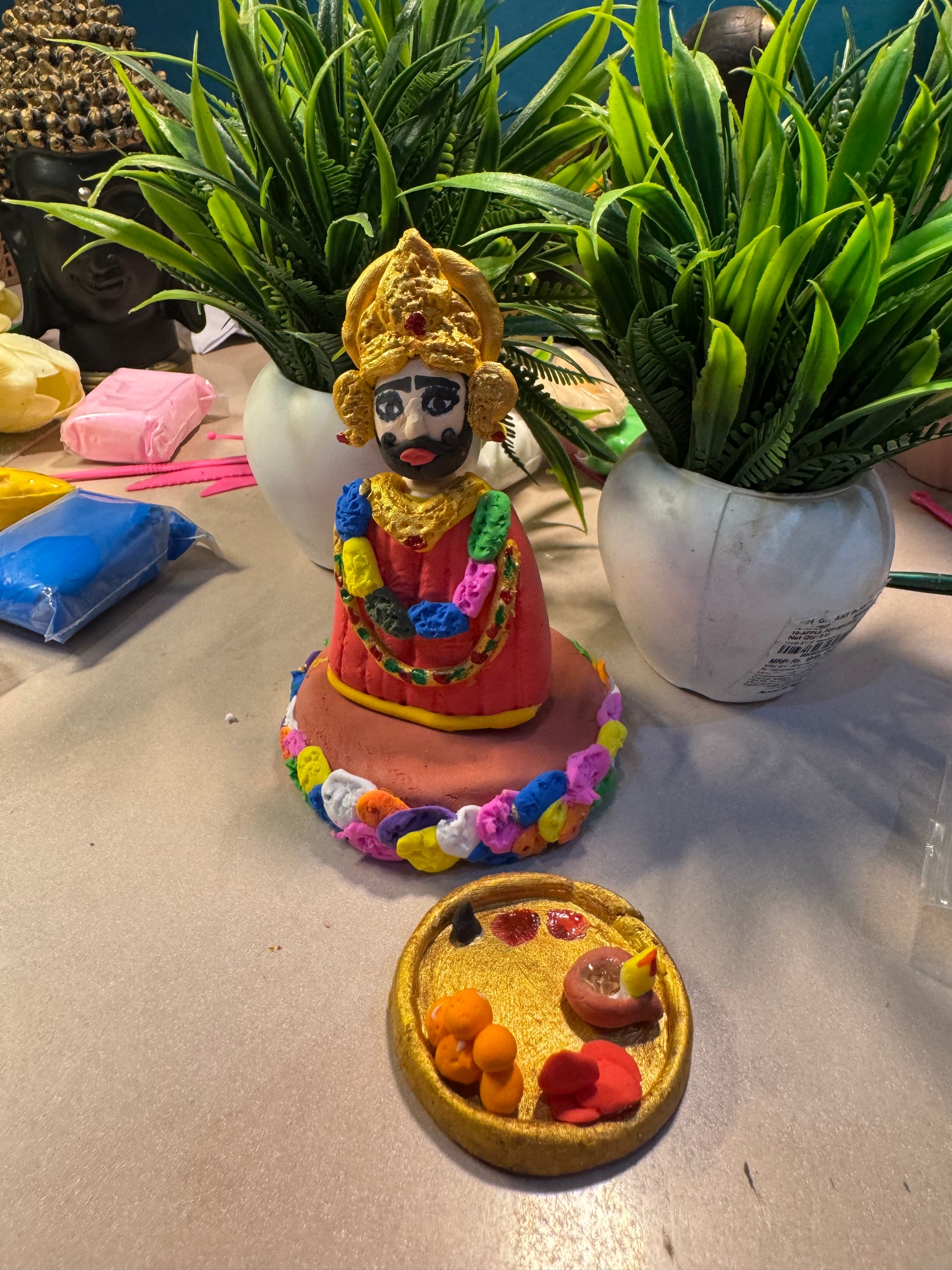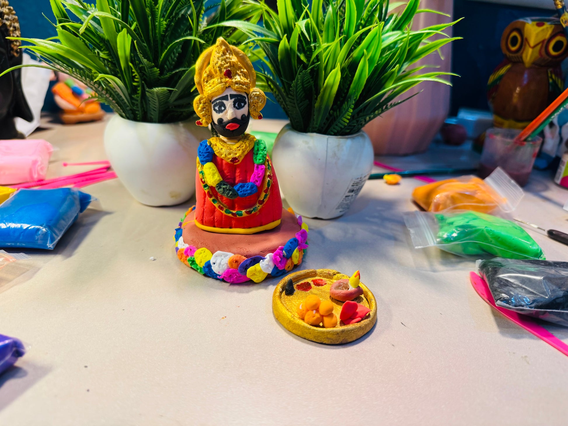 The set also includes a decorative pooja thali featuring clay diya, sweets, tilak, and prasad, all meticulously sculpted to add authenticity and charm.